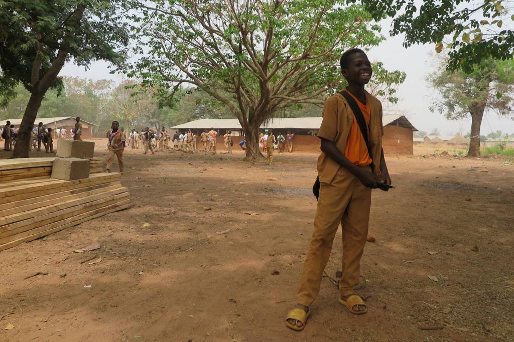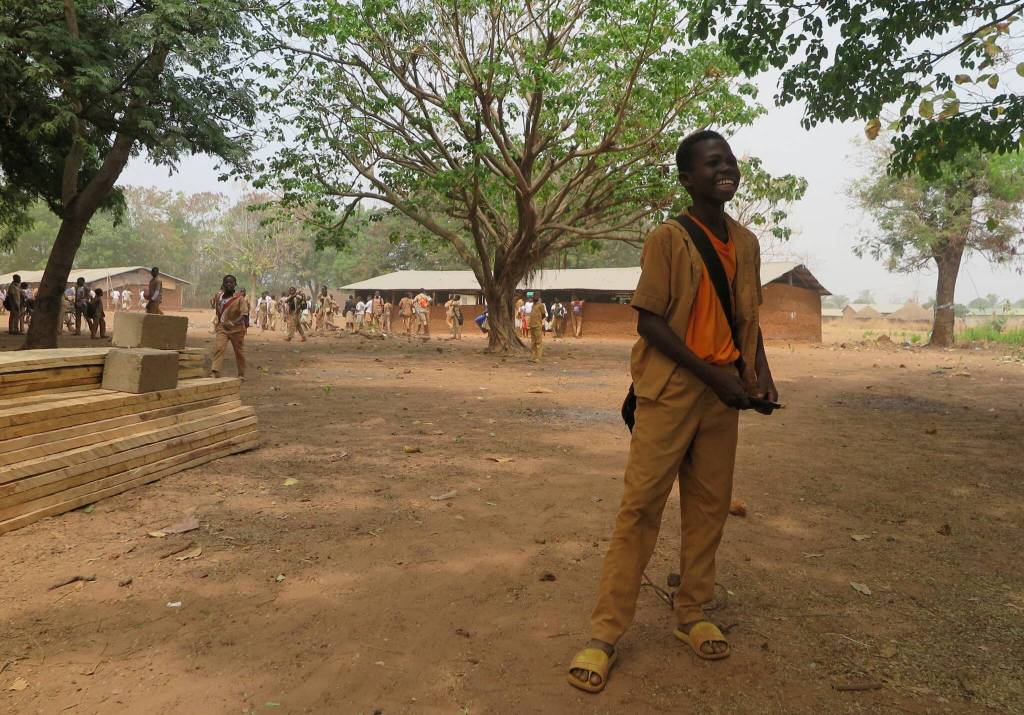 A student stands in front of building supplies and a temporary structure as a new secondary school goes up with help from a Juneau woman who used to live in the village in Togo.
