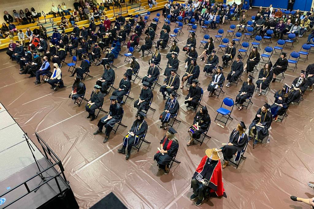 Students sit after receiving their diplomas at the commencement ceremony for University of Alaska Southeast on May 1, 2022. (Michael S. Lockett / Juneau Empire)