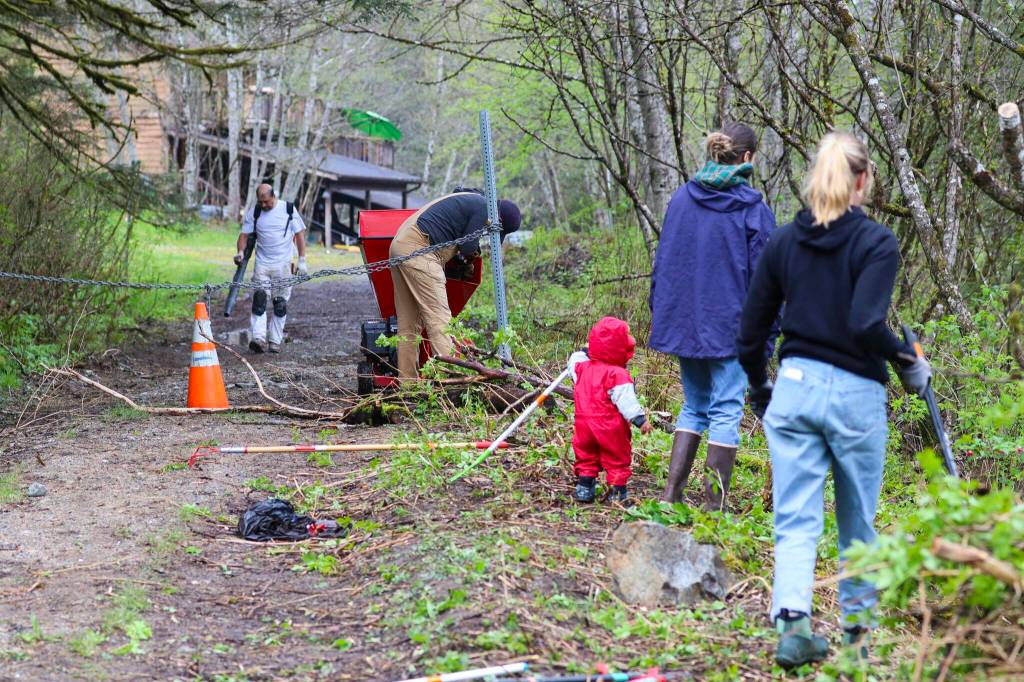 Volunteers clear deadwood and undergrowth as part of the cleanup of the cemetery near Lawson Creek on May 14, 2022. (Michael S. Lockett / Juneau Empire)