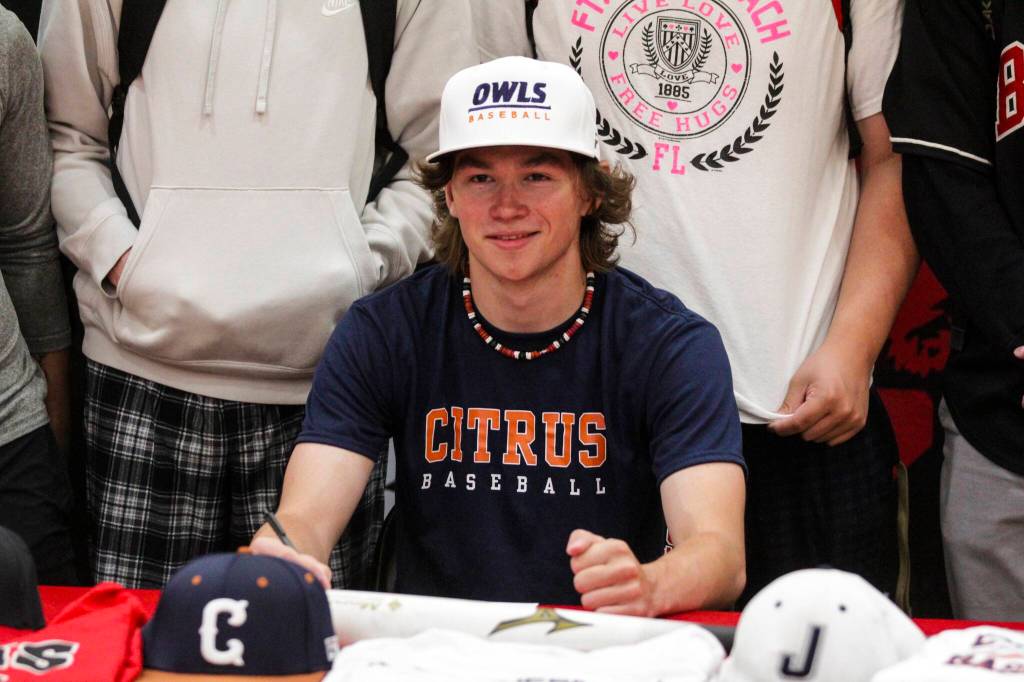 Porter Nelson, a senior at Juneau-Douglas High School: Yadaa.at Kalé, signed his letter of intent to play baseball for Citrus College, a community college located in Glendora, California, on May 24, 2022. “I was pretty stoked. I didn’t think they were going to answer my email,” said Nelson about the college extending the offer. “They’re the dream for me.” Nelson plays center fielder, and intends to study kinesiology, he said. (Michael S. Lockett / Juneau Empire)