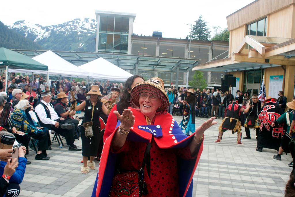 Several hundred people gathered in the outdoor square between Sealaska’s corporate building and new cultural center, where Alaska’s first 360-degree totem pole also was honored with an official debut. Rosita Kaaháni Worl, president of Sealaska Heritage Institute and moderator of the ceremony, began with combining historic tradition and breaking news by referring to this year’s official Celebration theme “Celebrating 10,000 Years of Cultural Survival.”