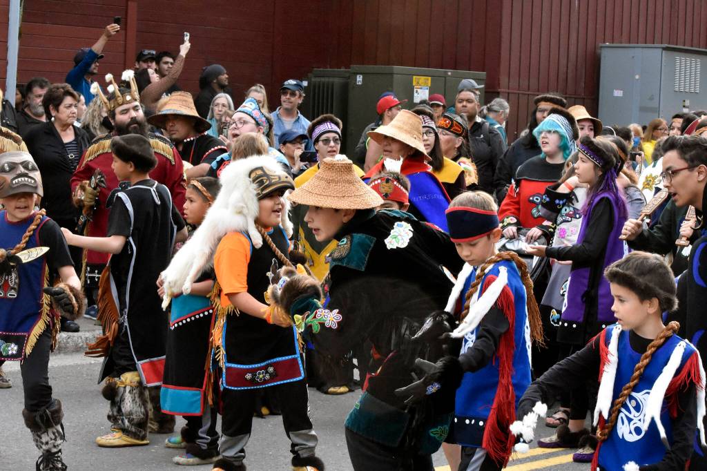 Regalia-clad celebrants thronged through downtown Juneau Wednesday evening carrying drums, flags, paddles and more as they prepared for Celebration 2022’s grand entrance at Centennial Hall.