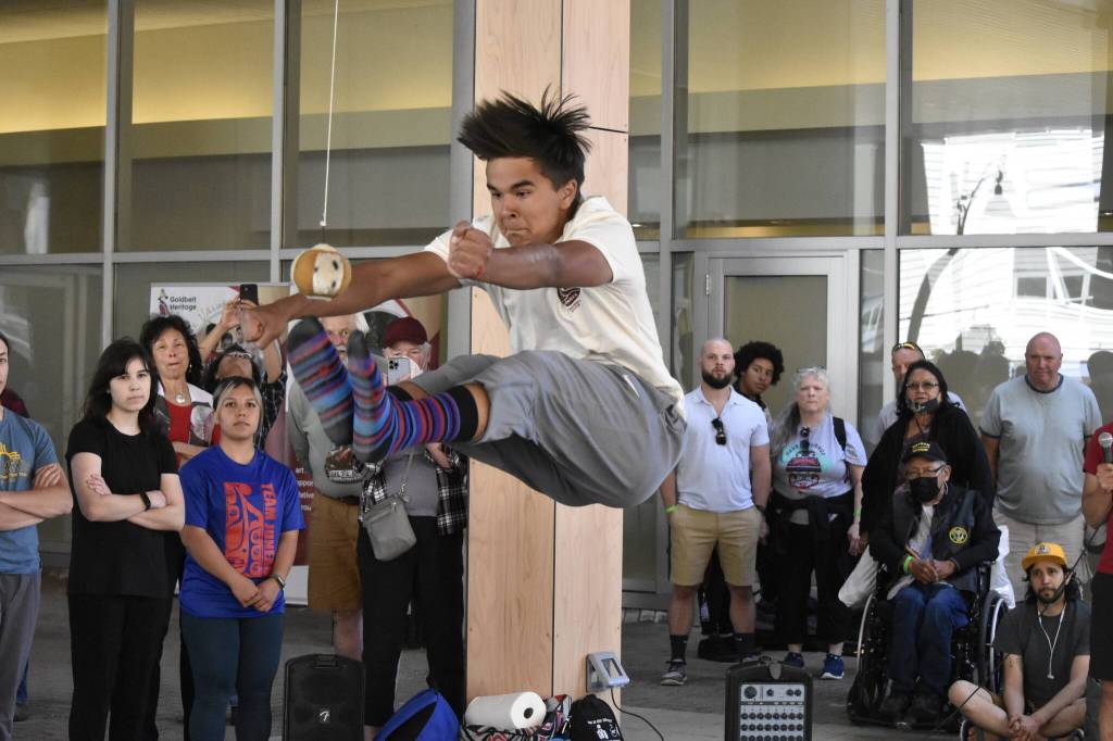 Local students and coaches demonstrated traditional Alaska Native games such as the Alaska high kick, two-foot high kick, the Inuit stick pull and others at Atnané Hít, or House of Art, the new Sealaska Heritage Arts Campus in downtown Juneau as part of the Celebration 2022 festivities.