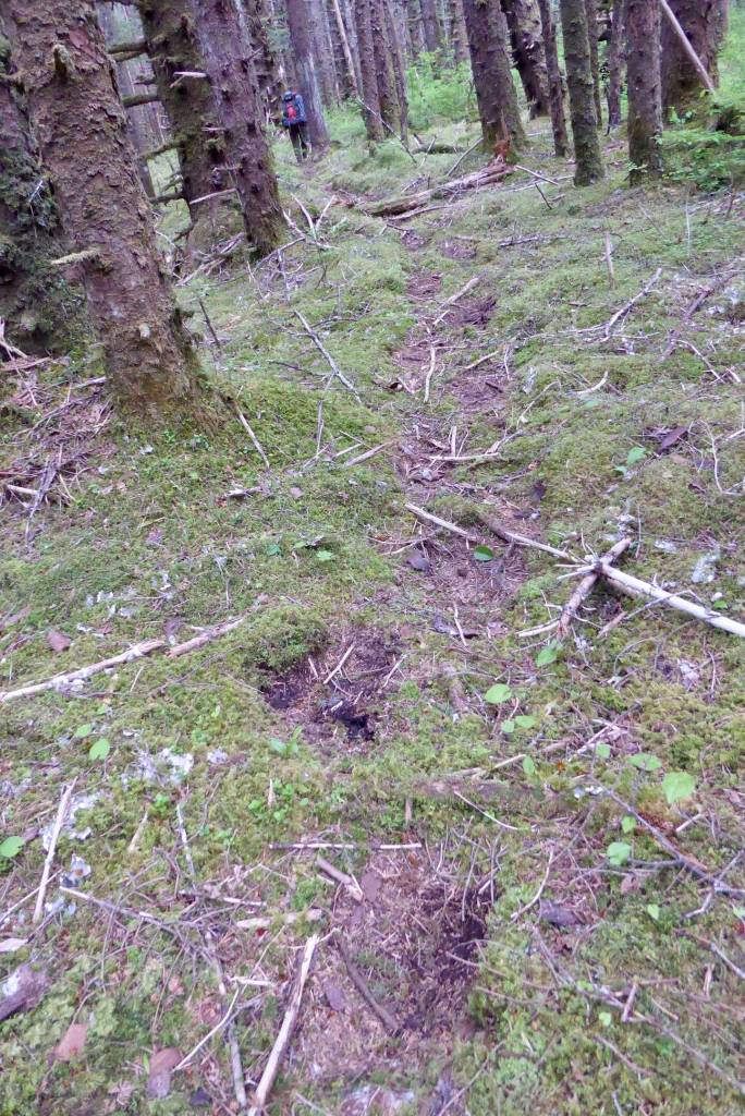The first creek we crossed on this trip filled my Xtratufs with clear water. The second creek forced a scientist to turn back to shore after he waded in to his chest hairs. Plan B to cross that waterway required a six-foot leap off a thick-limbed fallen spruce we used as a bridge. Be mindful not to grab the devil’s club on the way down.