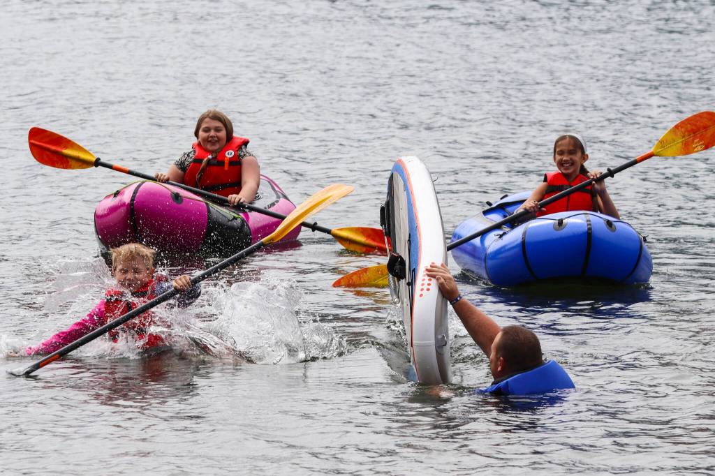 Kids practiced recovering after getting knocked out of a small craft or paddleboard, swimming in various kinds of personal flotation devices, and throwing rescue lines.