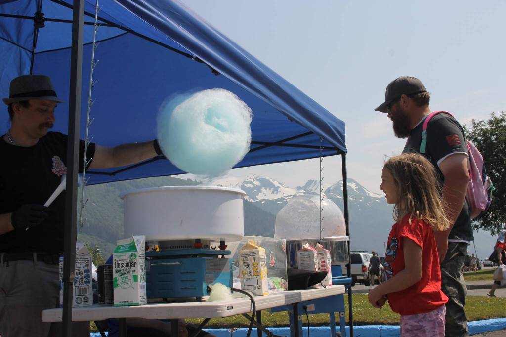 Denny and Linda Wahto brought their dog, Finn, with them all the way from the Mendenhall Valley to visit the Douglas Fire Hall ads Denny volunteered there for more than 20 years. Meg Thordarson, a volunteer firefighter and EMT who is in charge of the event said when the event first started years ago, it was only hot dogs, but she said the event has “graduated to also serving hamburgers.”