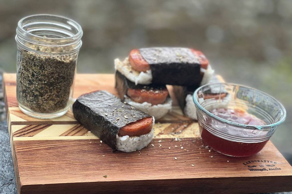 Into a medium-sized glass bowl, I pour in the toasted sesame seed mix then add in the all the other ingredients. Lastly, with my hands, I crinkle the sea lettuce into small bits and dump the handfuls into the mix and stir. I scoop the seasoning into three small jelly jars that have been cleaned and dried. I put the lids and rings on the jars, and then poke holes in the lid. The seasoning will last about six months. Use Southeast Alaskan furikake as you would any steak or fish seasoning. Sprinkle it on your rice or noodle dishes too. Popular uses for furikake are mixed in onigiri (rice balls), sprinkled on sushi, ramens, omelets, and tofu. Also, try sprinkling Southeast Alaskan furikake on potato and macaroni salads. Use it to season fries, vegetables, and soups. To try out the furikake I’m making Spam musubi for dinner, though I’m excited to make salmon and halibut musubi this summer. There are many ways to sprinkle, or should I say “furikake” your foods with summer.