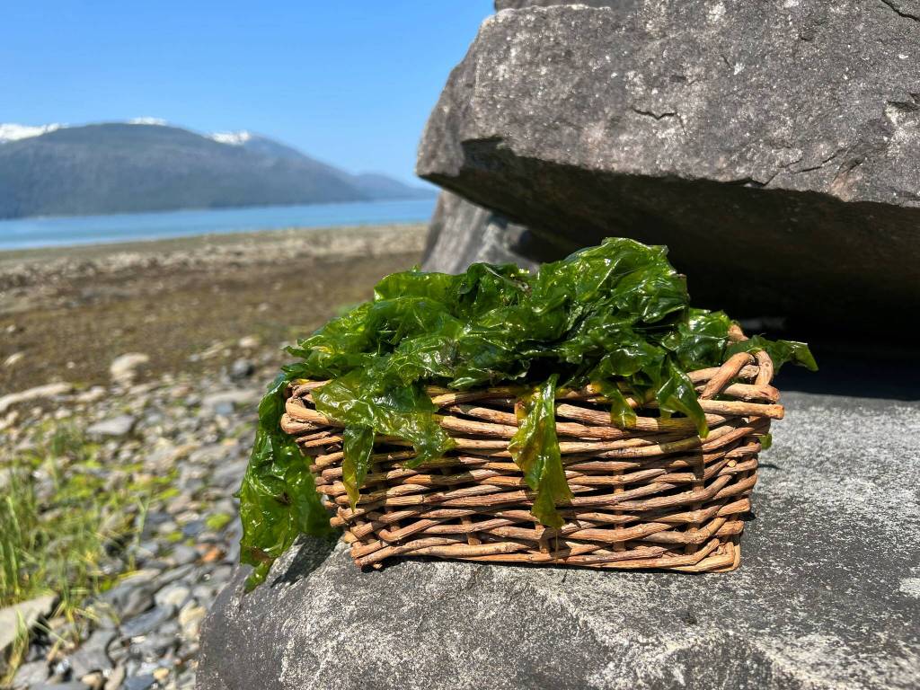 I pick up a big frond and put it atop the pile of wet seaweed. “Gunalchéesh, sea lettuce,” I say. With my full basket, I head back along the beach to my seawall and up a set of stone stairs to my cabin.