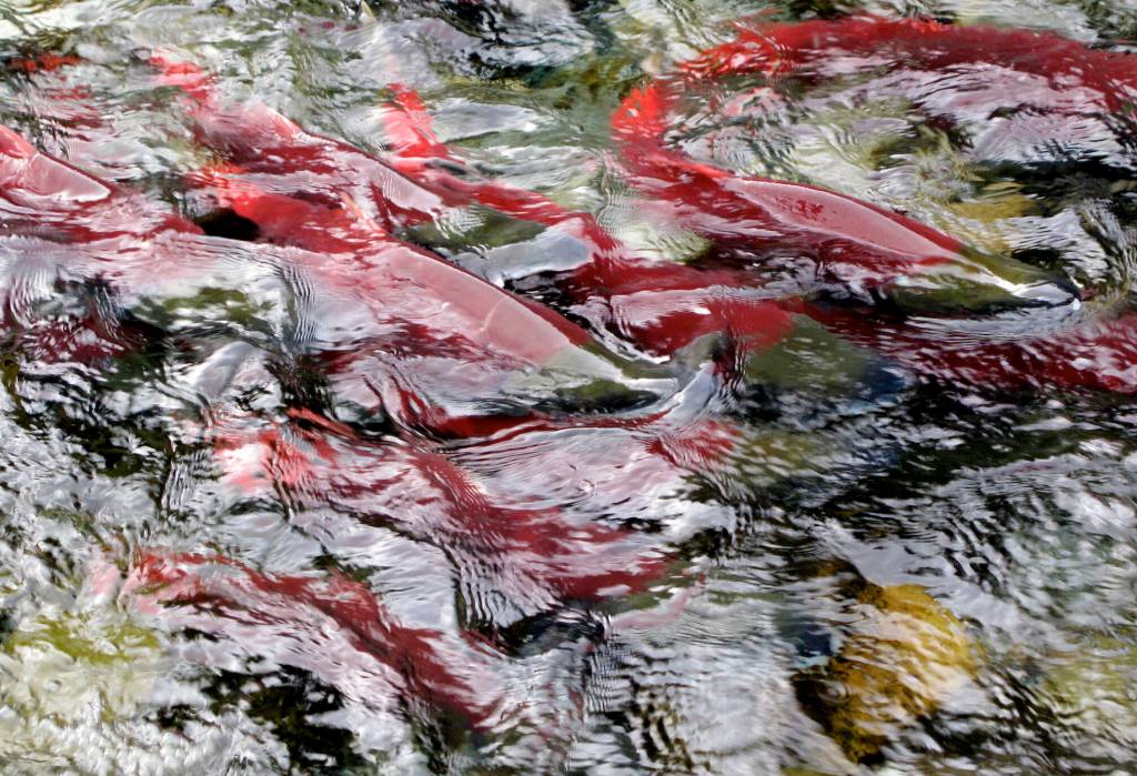 Red salmon gather at a Gulkana Hatchery fish weir that prevents them from going upstream on the east fork of the Gulkana River.(Courtesy Photo/ Ned Rozell)