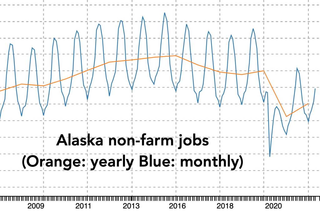 A chart shows statewide non-farm jobs since 2007 which remained relatively stable until the sharp drop caused by the COVID-19 pandemic in 2020. While the total has recovered somewhat, employment is still well below pre-pandemic levels and state labor officials said they cannot yet project if and for how long the increase in recovery will continue, (Alaska Department of Labor)