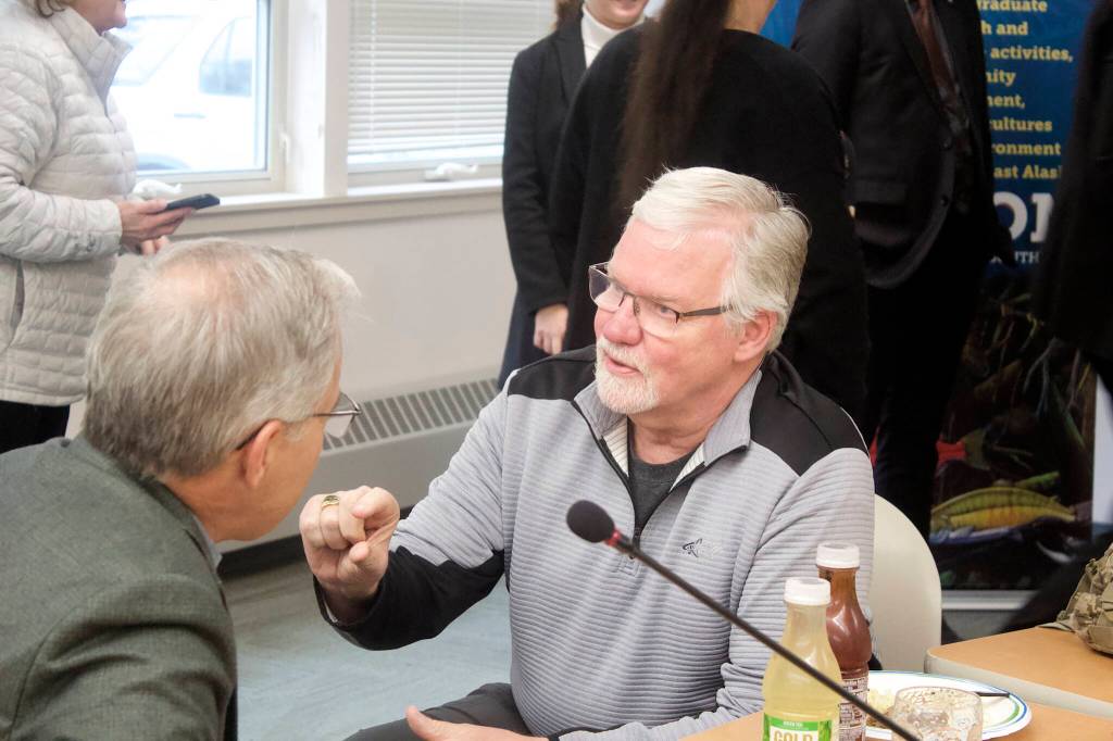 Dale Anderson, a member of the University of Alaska’s Board of Regents, talks with fellow member Ralph Seekins after the conclusion of the board’s two-day meeting at the University of Alaska Southeast on Friday. Anderson was harshly critical during Friday’s meetings of changes to Title IX, which is again being revised in anticipation of pending changes at the federal level, saying it’s being expanded in “insidious” ways beyond its original intent. (Mark Sabbatini / Juneau Empire)