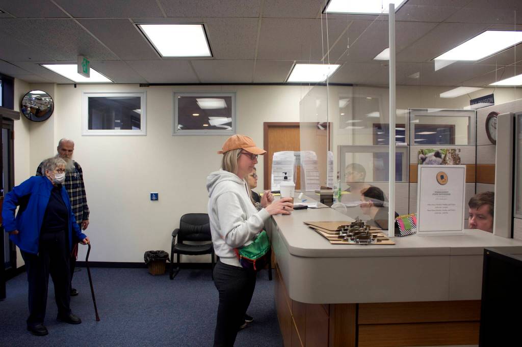 Kelsey Martin asks about the status of her son’s Permanent Fund Dividend check after arriving first at Juneau’s PFD office in the State Office Building on Tuesday, the first day direct deposit payments of the $3,284 dividends are being credited. Eligible residents who did not receive direct deposits will be paid by checks that will be mailed starting Oct. 6.