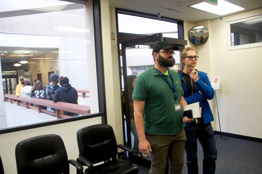 Garrett Lathrop and his son, Grant, wait in line at the Permanent Fund Dividend Division office in the State Office Building to learn why their first-ever dividends were not credited by direct deposit as requested. A steady steam of people arrived during the morning, but most inquires were resolved quickly.