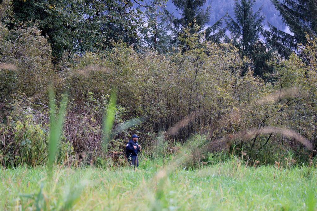 On Thursday morning at the crime scene, JPD Officer Austin Thomas and Officer Taylor Davis walk the fielded area which was blocked off by crime scene tape. Multiple tents and a police vehicle sat in the field where the tape surrounded, another police vehicle sat in a dirt parking area. (Clarise Larson / Juneau Empire)