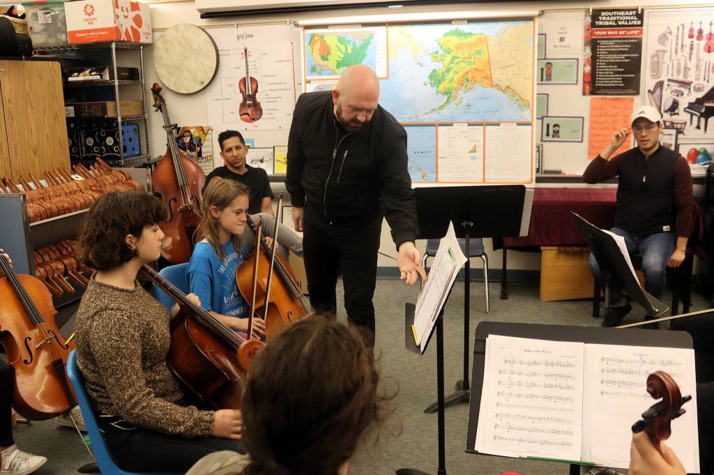 Friday’s gathering at Sitʼ Eeti Shaanáx̱ Glacier Valley Elementary School with McDaniel and the two other members of Simply Three, a nationally acclaimed classical crossover string trio, was a chance for the youths to get tips from the pros before both took the stage for their respective shows Saturday at Juneau-Douglas High School: Yadaa.at Kalé.