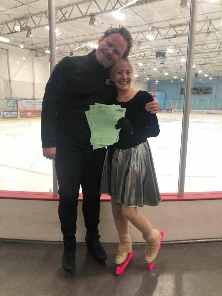 Wendy Vuille poses with American ice dancer and two-time alternate for the Olympic Games, Todd Gilles. Gilles partnered with Vuille at the Arizona Adult Skating Camp where she passed her Masters Gold Dance with the United States Figure Skating Association. Vuille in this photo is holding the judges forms shortly after passing her gold medalist in ice dance. (Courtesy Photo / Wendy Vuille)