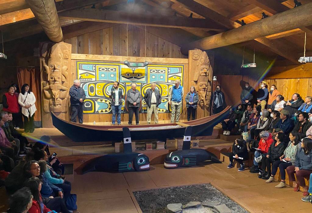 One by one, I followed as people ducked in through the Clan House entryway to come in from the rain and join together for the Warming of the Hands ceremony, the opening welcome to the 2022 Sharing Our Knowledge Conference (Wooshteen Kanaxhtulaneegí Has At Wuskóowu). The Stikine Ḵwaan clan leaders stood at the front of the full house, first introducing themselves, then welcoming the visitors to Wrangell. They proudly welcomed the Inland Lingít who had traveled down from the interior. They responded, filling the room with a loud and full “Gunalchéesh!” (thank you) that eased the room into an atmosphere of respect.
