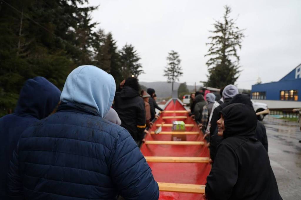 ANGOON — Dozens of small hands and one large pair held a firm grip on the 30-foot-long dugout canoe they pushed down Front Street despite their shoes slipping on the rain-soaked road.