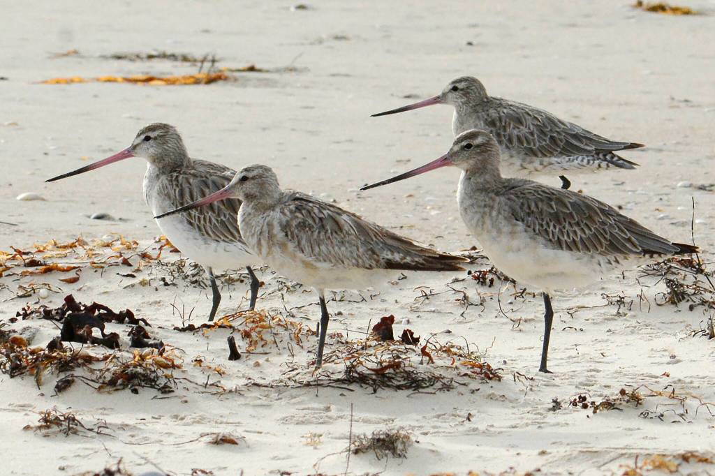 Bar-tailed godwits stand on the beach at Marion Bay in Australia's Tasmania state on Feb. 17, 2018. A young bar-tailed godwit appears to have set a non-stop distance record for migratory birds by flying at least 13,560 kilometers (8,435 miles) from Alaska to the Australian state of Tasmania, a bird expert said Friday, Oct. 28, 2022. (Eric Woehler)