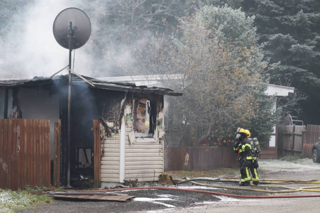 CCFR responding to a trailer fire at Sprucewood Park in Mendenhall Valley Wednesday morning at approximately 8:30 a.m. No injuries were reported. (Jonson Kuhn / Juneau Empire)