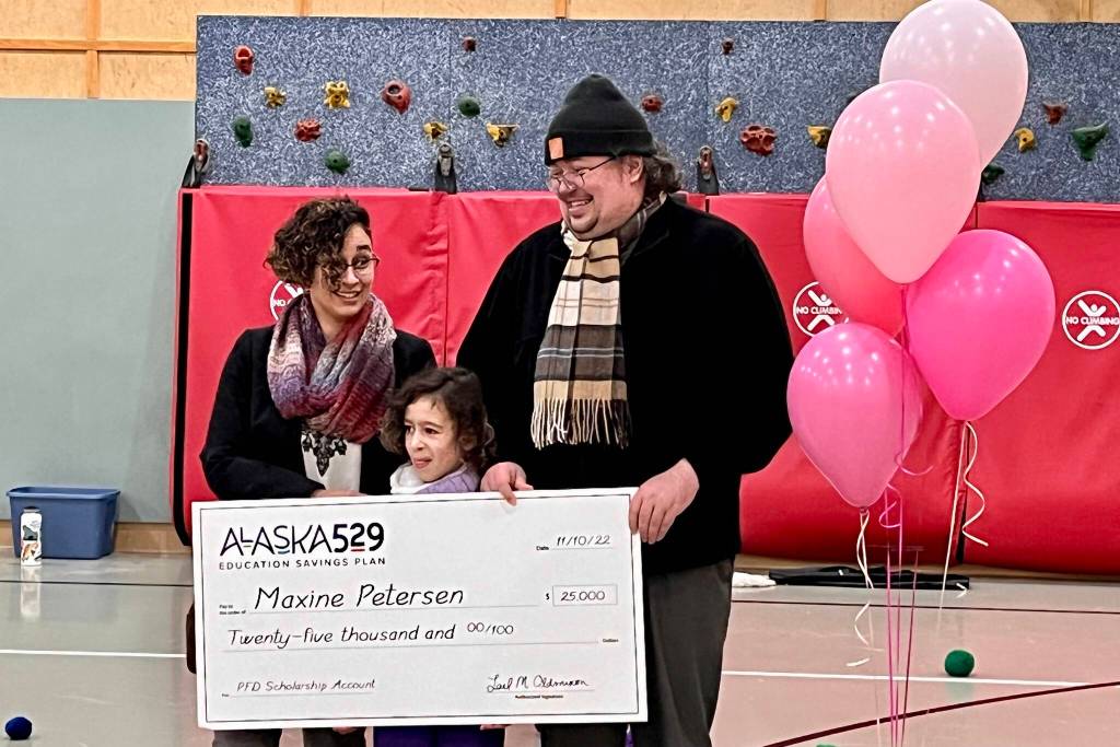 Maxine Petersen, 8, stands with her parents Carl Petersen and Samantha Jenkins to accept the Alaska 529 annual $25K Giveaway at Kax̱dig̱oowu Héen Elementary on Thursday. Maxine is the first recipient to receive the scholarship within Southeast. (Jonson Kuhn / Juneau Empire)