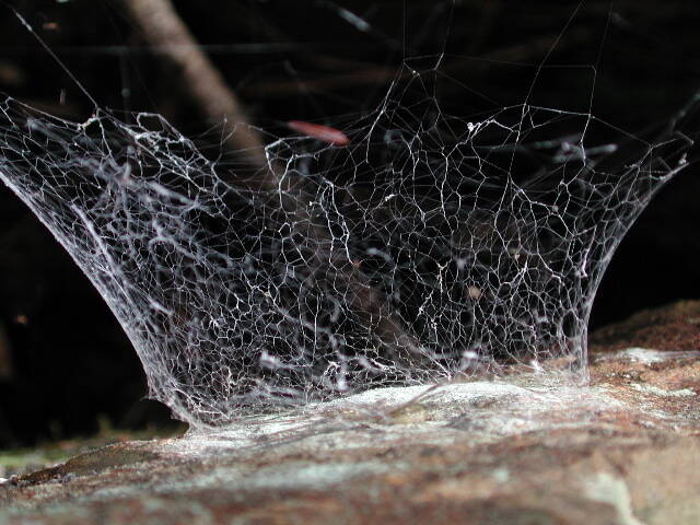 Funnel-web spiders build silken tubes under rocks or in crevices of rock or thick tree bark. In front of this retreat, trip lines extend, sending a signal when a likely prey approaches. These Australian spiders are famous for their venom. They are not the same as the funnel weaver spiders, which are wide-spread across the world (and sometimes confusingly called funnel-web spiders too). Funnel weavers hide in a silken, funnel-shaped retreat; a thick silk sheet lies like a doormat lies in front of the funnel; this not only announces the arrival of prey but the mat surface is springy and full of entangling filaments that also slow down a walking prey animal, making it easier to capture.