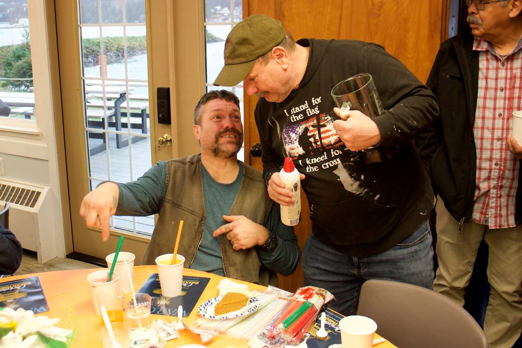 Garrett Derr, sitting at one of the large round tables with a group of old and just-made friends, spent his time before getting a meal from a volunteer server sketching the Douglas Island landscape just outside the window that included the cabin his grandparents lived in long before statehood. In one corner of the paper was a list of names of the people he’d met during the meal after getting a ride there from his room at the Glory Hall.