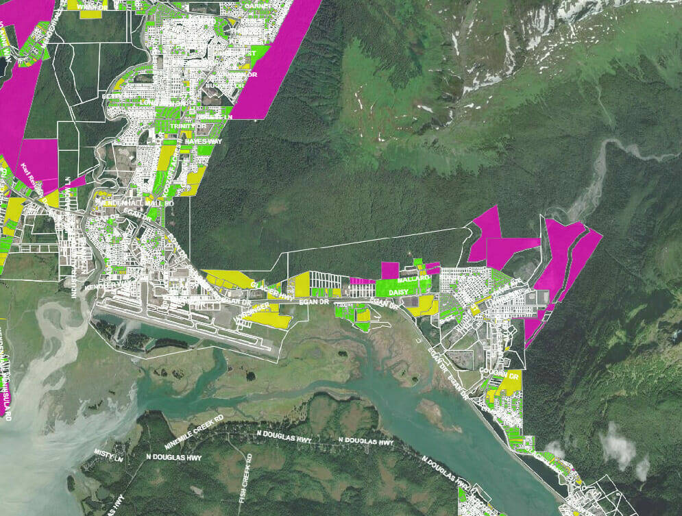 This image is a screen grab of an interactive online map that outlines the different pieces of vacant and underdeveloped property in Juneau. According to the map website, privately owned vacant parcels are highlighted yellow, CBJ Lands and Resources owned vacant parcels are highlighted pink and private developed properties below maximum allowable housing density are highlighted green. (Courtesy / City and Borough of Juneau)