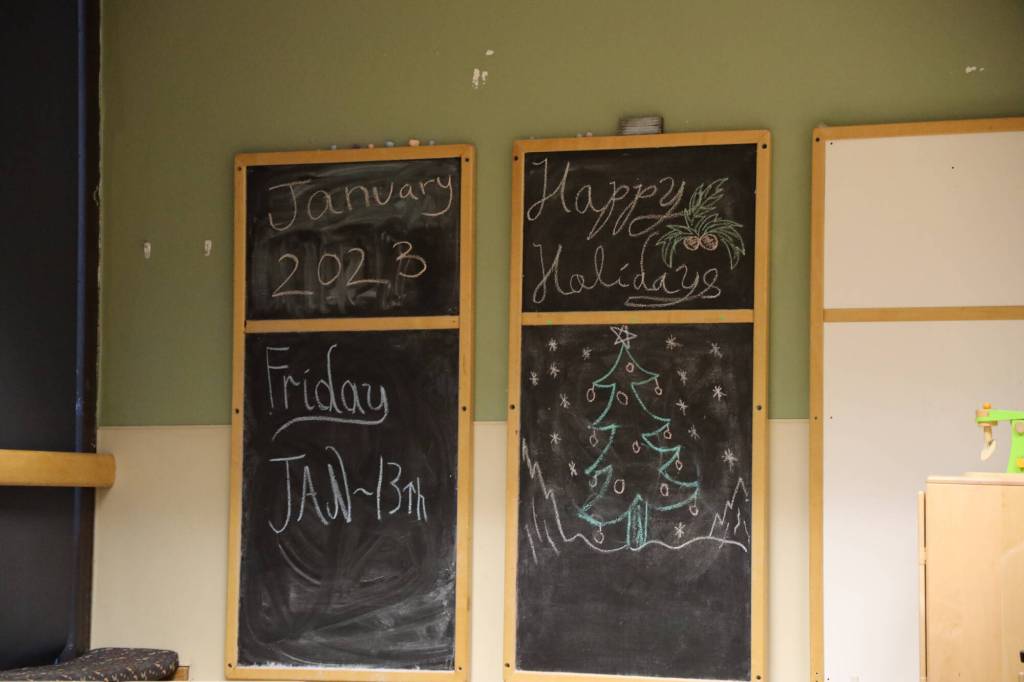 A chalkboard hangs on a wall at the downtown Gold Creek Child Development Center still reads the date as Friday, Jan. 13 days after the center’s temporary closure.