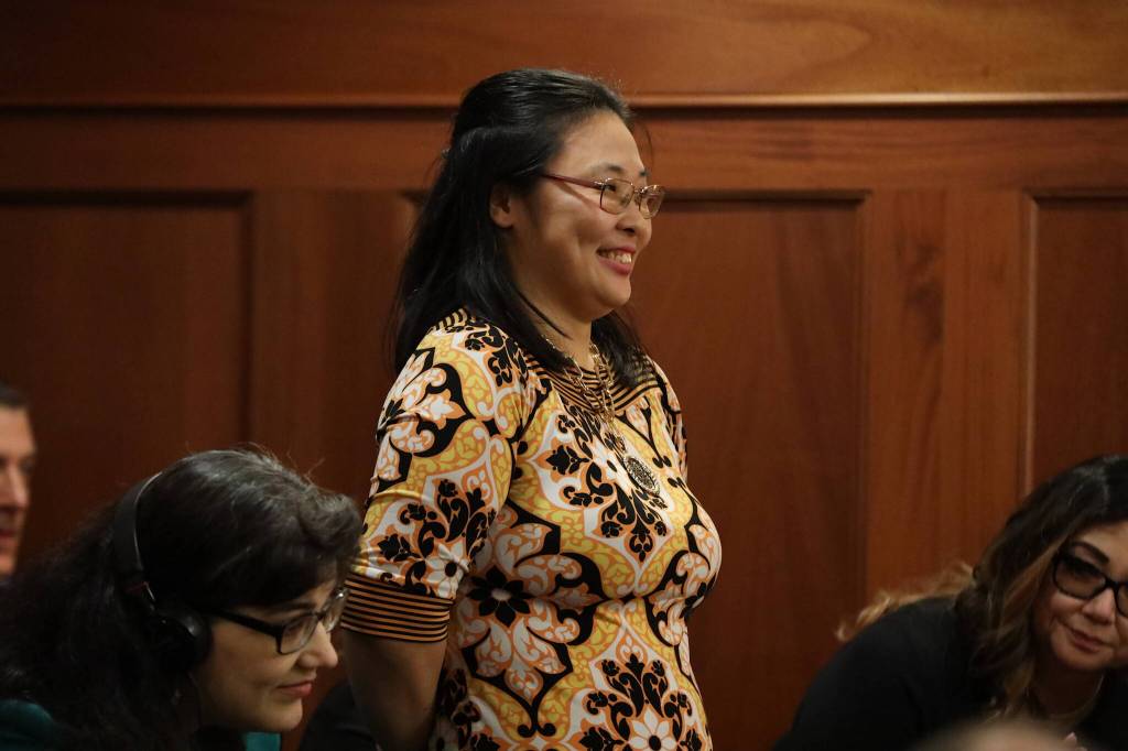 Katie Botz, a Juneau school bus driver honored by Gov. Mike Dunelavy for her advocacy on behalf of abuse victims, stands to applause during his recognition of her during the State of the State speech Monday night at the Alaska State Capitol. (Clarise Larson / Juneau Empire)