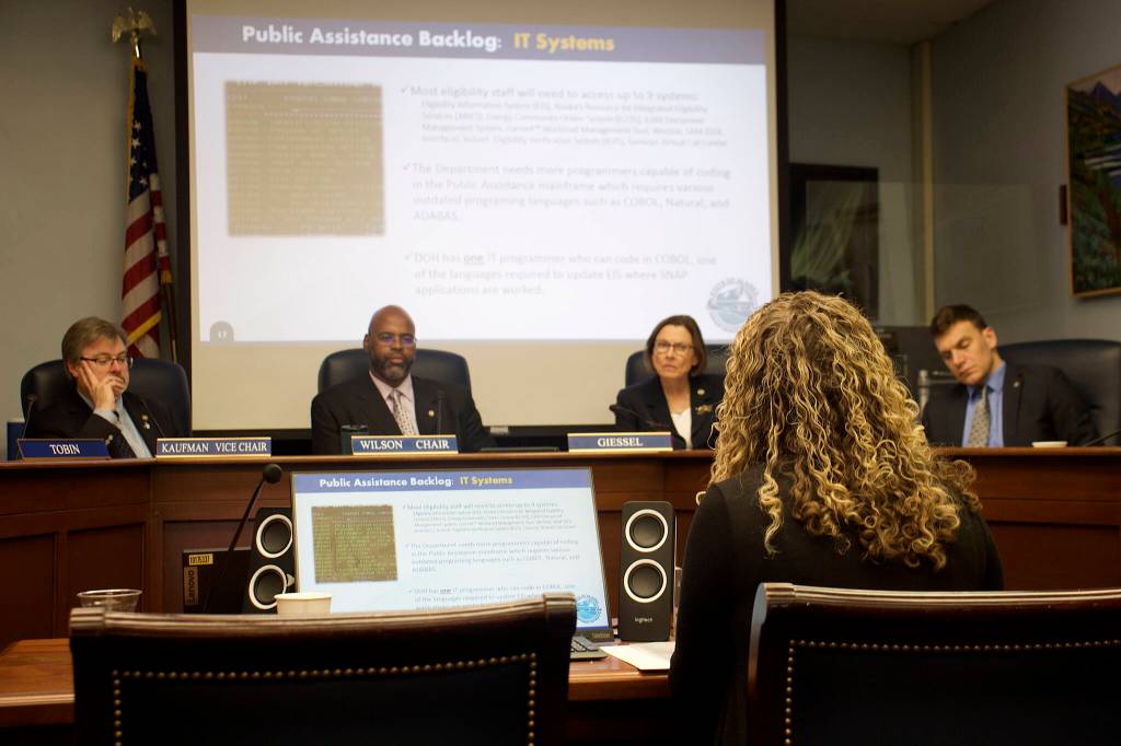 Hedberg and other top department officials got their first grilling from state lawmakers about the backlogs during a Senate Health & Social Services Committee meeting Tuesday at the Alaska State Capitol. Among the particularly illustrative examples of issues she highlighted during the 90-minute meeting is a computer processing system that uses 1959 technology only one person can program and the computer relies on data from eight other computer systems.