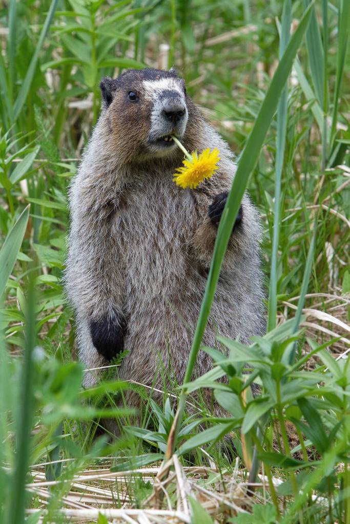 A hoary marmot nibbles a dandelion (Courtesy Photo / Jos Bakker)