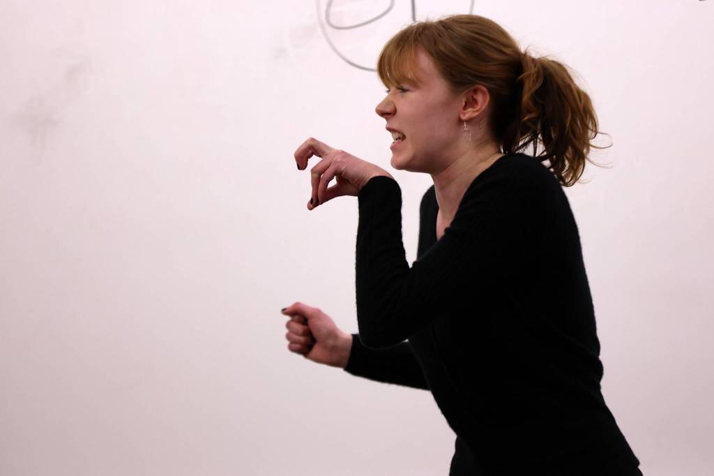Rachel Wood pantomimes launching a rocket near the end of Ian McWethy’s “Bad Auditions by Bad Actors” during the humorous interpretation final. (Ben Hohenstatt / Juneau Empire)