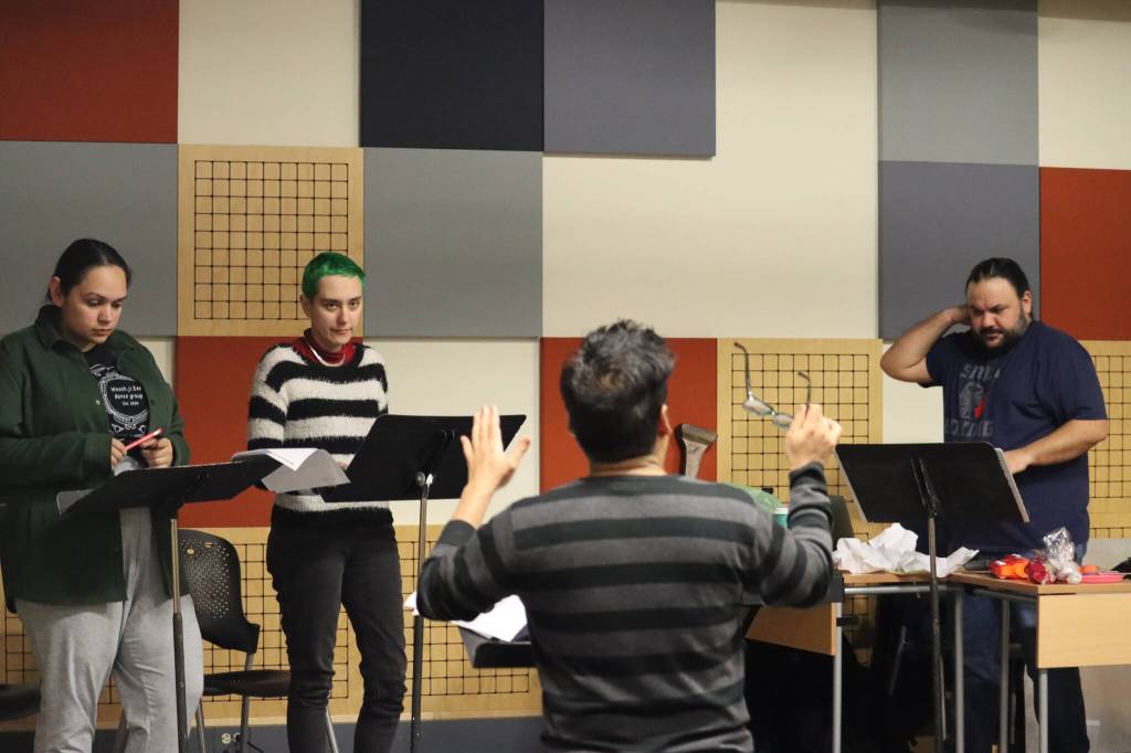 Flordelino Lagundino, middle, directs the cast of Frank Henry Kaash Katasse’s newest play, “Reeling,” as part of the Alaska Theater Festival: Radio Plays on Wednesday at KTOO Studios. “Reeling” will be performed in-person and on-air this Saturday at KTOO Radio Station. (Jonson Kuhn / Juneau Empire)