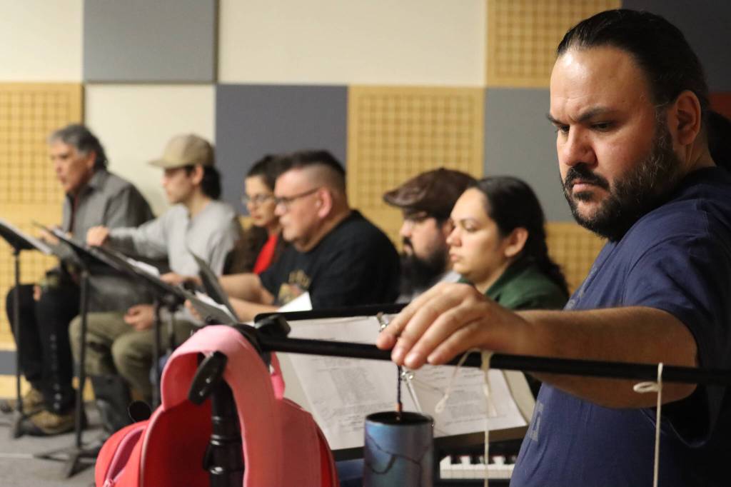 During a Wednesday rehearsal at KTOO studios for the Alaska Theater Festival: Radio Plays, Shaakindustoow Ed Littlefield, seen here, is joined by the cast of Vera Starbard’s, “The Beginning of Eagle” which is an adaptation from stories shared by DaaXKu dein Tommy Jimmie. “The Beginning of Eagle” will be performed Saturday live in-person at KTOO studios as well as on-air at KTOO News 104.3 and 91.7, and online at ktoo.org/listen. (Jonson Kuhn / Juneau Empire)