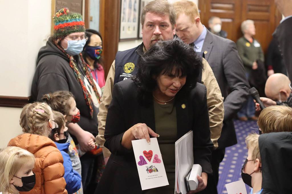 The prominence of the base student allocation as an issue during this legislative session got one of its high-visibility moments Monday as a couple dozen preschool students from Montessori Borealis in Juneau wandered the halls of the Alaska State Capitol with their adults and teachers offering Valentine’s Day cards (along with fliers requesting the per-student funding formula be increased).