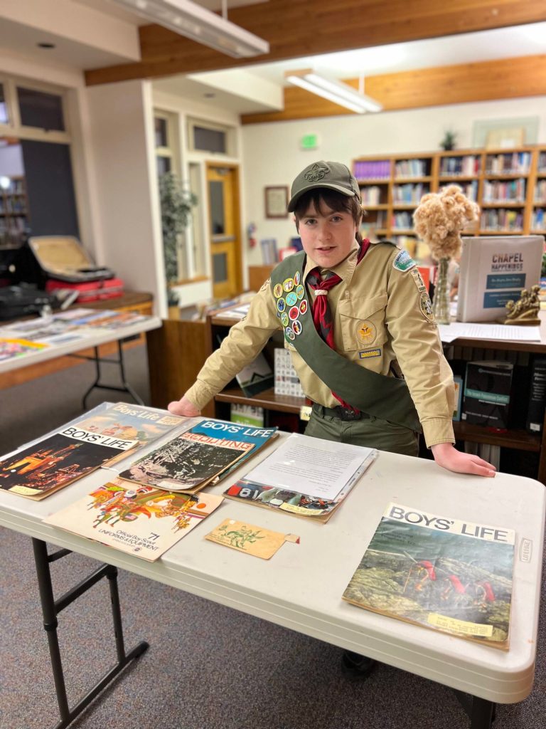 Boy Scout Troop 6 hosted a scouting heritage night on Monday to celebrate 110 years of documented scouting in the Juneau/Douglas area. The event was the culmination of the scouts working to complete their Scouting Heritage Merit Badge which requires participants to research and report on historic scouting figures, iconic scout locations and exploring their troop’s history. One specific requirement asks scouts to either visit an established scouting museum or create one. For the merit badge, each scout chose a topic to report on and prepared a display table to help explain their specific person or place. These included key figures in scouting history like Waite Phillips or Daniel Carter Beard or scouting destinations like the Philmont Scout Ranch in New Mexico. The troop’s Senior Patrol Leader Max Webster, completed his report on the history and significance of Boys Life Magazine which came into publication in 1911.