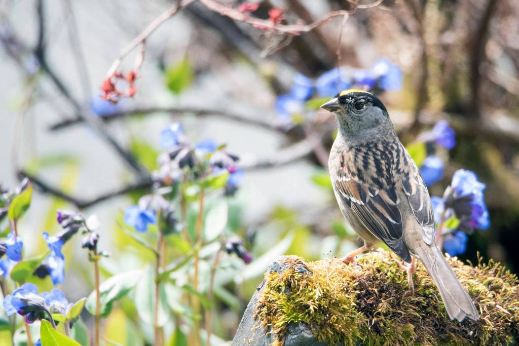 Golden-crowned Sparrow with springtime flowers out the road, Juneau, Alaska. (Courtesy Photo / Kenneth Gill, gillfoto)