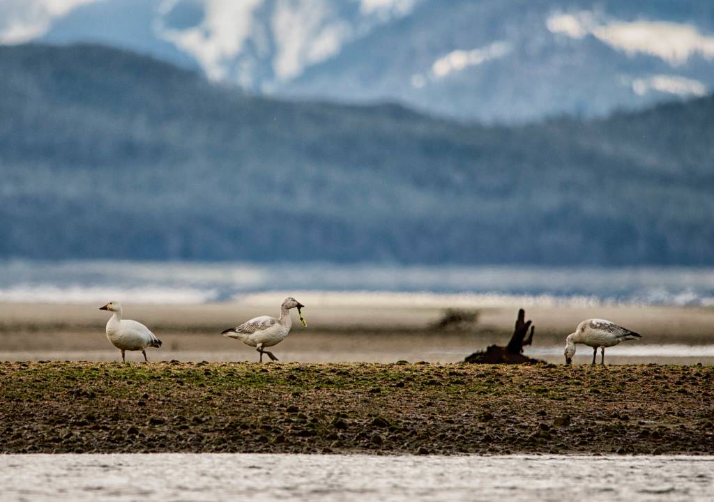 The tide was out at Eagle Beach with three snow geese feeding on seaweed. (Courtesy Photo / Kenneth Gill, gillfoto)