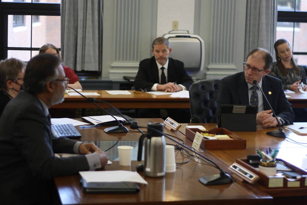 State Sen. Jesse Kiehl, D-Juneau, right, asks Ajay Desai, director of the Alaska Division of Retirement and Benefits, about the assumptions used to calculate pensions earned by state employees under a fixed-amount plan in effect until 2006 and a subsequent 401K-type plan during a Senate Finance Committee hearing Thursday at the Alaska State Capitol. (Mark Sabbatini / Juneau Empire File)