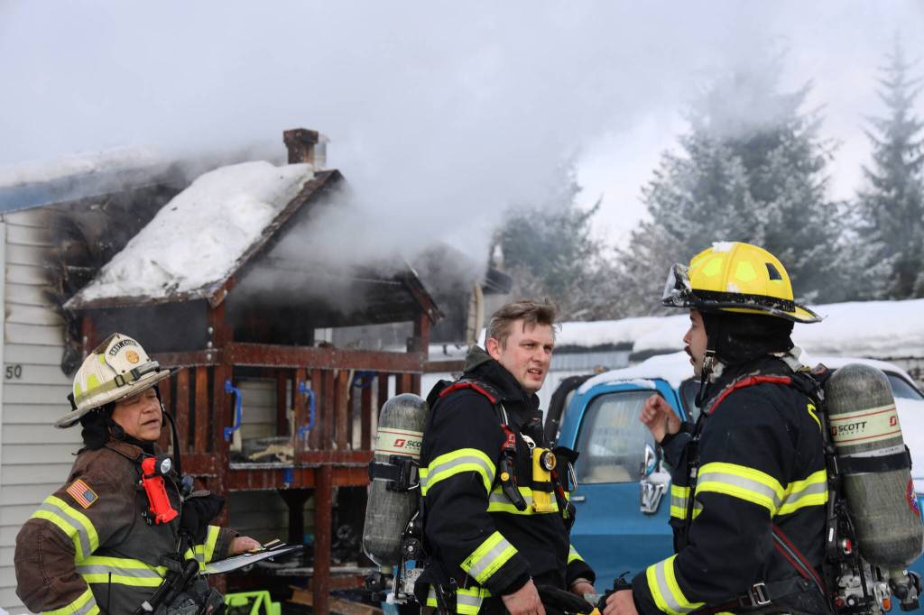 Capital City Fire/Rescue firefighters move to extinguish a trailer fire Friday morning. The cause of the fire is believed to be caused by an electric toaster, officials say. (Clarise Larson / Juneau Empire)