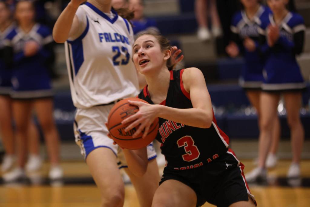 JDHS senior Carlynn Casperson takes a shot against TMHS during a conference game earlier this season. The Lady Falcons are the number one seed in conference for this year’s Region V tournament. (Ben Hohenstatt / Juneau Empire)