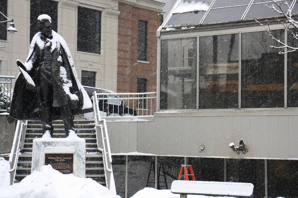 Snow blankets the courtyard outside the Juneau - State Courthouse, where a sit-in starting at 8 a.m. Wednesday was announced by people protesting what they called unconstitutional restrictions recently placed on grand juries. Only one protester said she came by shortly before noon, but didn’t stay long because no other people were there. Similar (Mark Sabbatini / Juneau Empire)