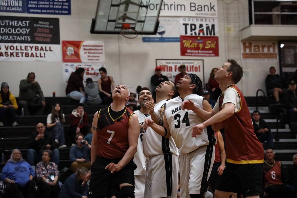 Players of Juneau and Angoon’s Gold Medal Tournament Masters Bracket basketball team’s search for the ball above them after a failed three-point attempt Sunday afternoon a part 74th Juneau Lions Club Gold Medal Basketball Tournament. (Clarise Larson / Juneau Empire)