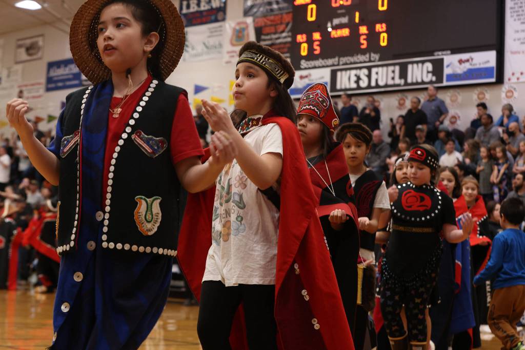 The donations were part of a performance by a regalia-clad group that included Eagle Raven Dancers, Wooshji.een and students in the TCLL program among others before a Thursday evening Gold Medal Basketball Tournament game tipped off. The performance included Southeast Alaska Native song and dance as well as a portion in which attendees of the long-running basketball tournament were invited to make donations when they heard the name of their community.