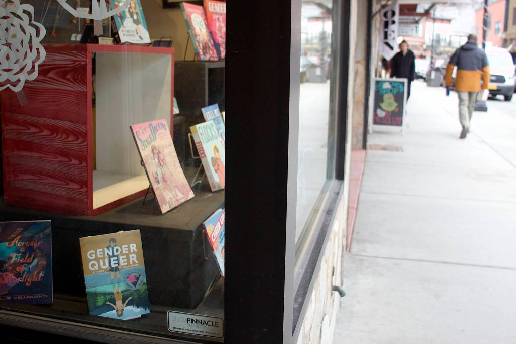 A collection of books including LGBTQ-friendly titles are displayed in the storefront window of Alaska Robotics in downtown Juneau on Tuesday. The store, which featured books and cards illustrated by local artist Mitchell Watley, removed them following his arrest Sunday for allegedly placing transphobic notes threatening violence against children at locations around town.