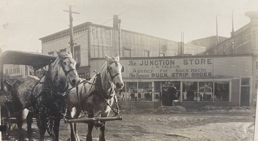 During the 1920s, the triangle corner building housed the Junction Store serving miners and others as a general hardware store. A historical photo of this enterprise includes another foundational Juneau business: two dappled horses pulling a wagon that are the first drayage team belonging to Reliable Transfer.