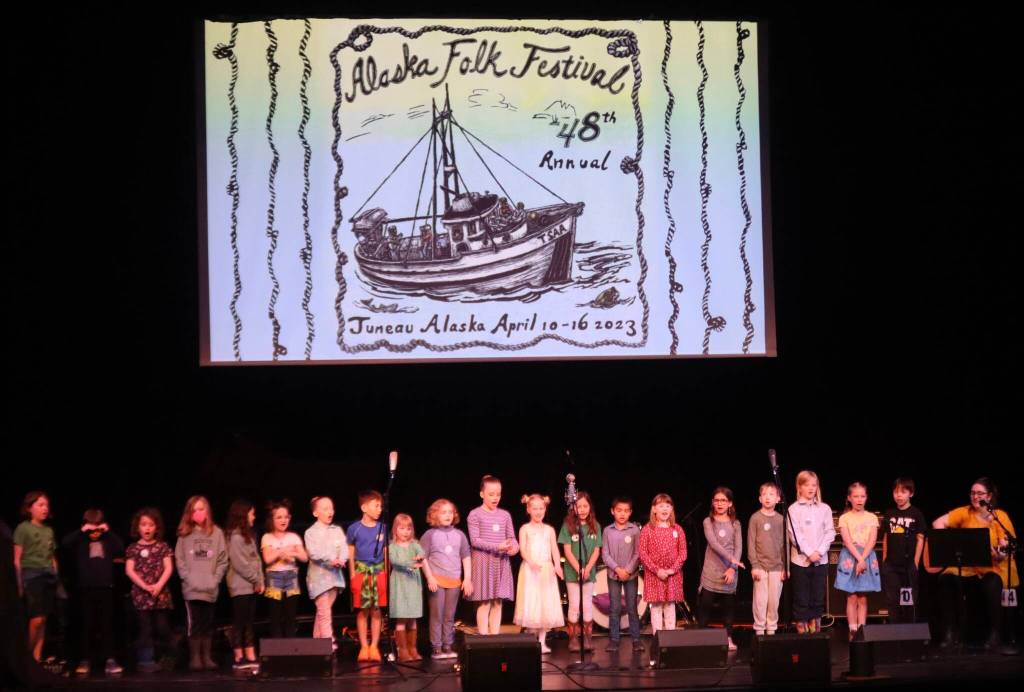 Ursa Minor Singers comprised of first through third graders from Montessori Borealis Public School accompanied by teacher Callie open Saturday’s performances at JDHS for this year’s Alaska Folk Festival. (Jonson Kuhn / Juneau Empire)