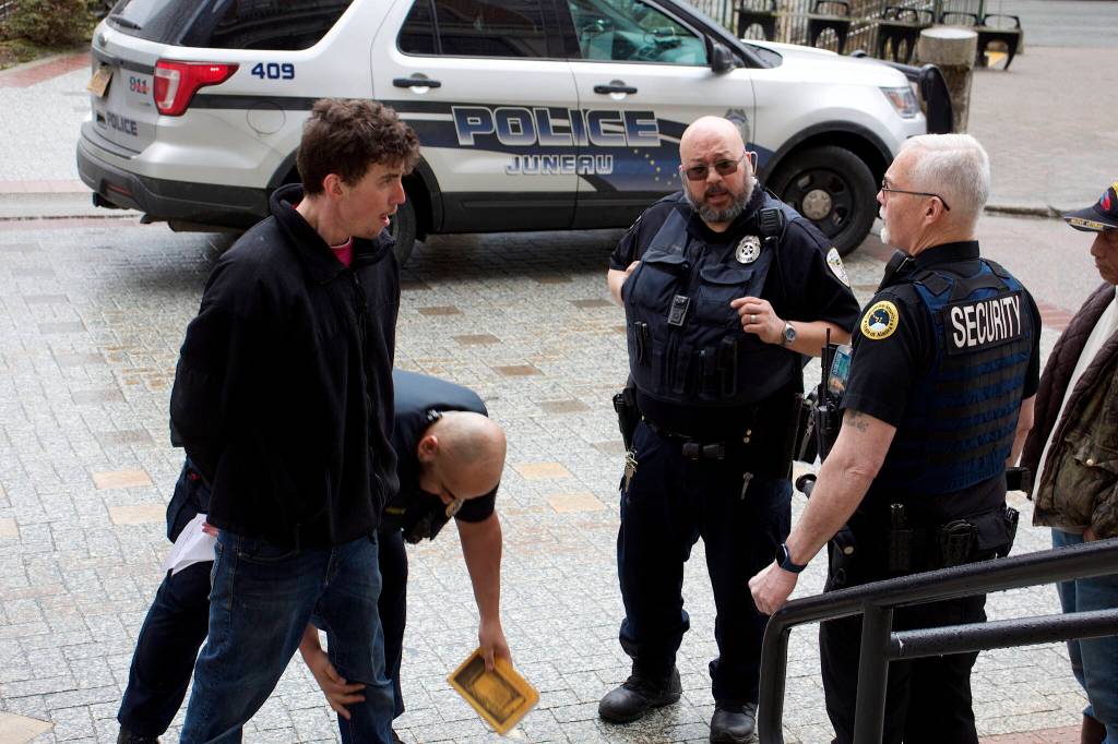 Eric Osuch, 23, was banned from the Capitol for one year after disrupting a Senate Finance Committee meeting at about 9:30 a.m., shouting to at least one lawmaker on the committee who’s a target of his ire. Osuch was handcuffed and detailed by two security officers in the entryway of the Capitol until a Juneau Police Department officer arrived to formally serve him with the notice banning him from returning, although Osuch said he planned to return for a 2 p.m. meeting scheduled with a legislator regardless of the order.