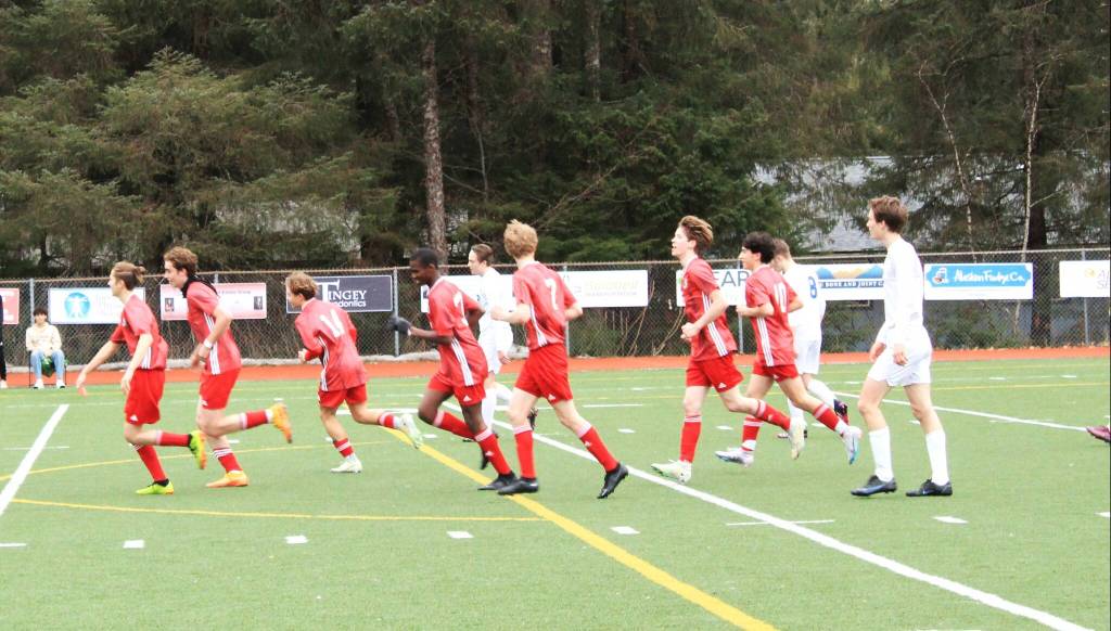 The Juneau-Douglas: Yadaa.at Kale High School Crimson Bears boys soccer team beat cross-town rival Thunder Mountain High School Falcons 8-0 on Monday evening, the second meeting of the teams this season.